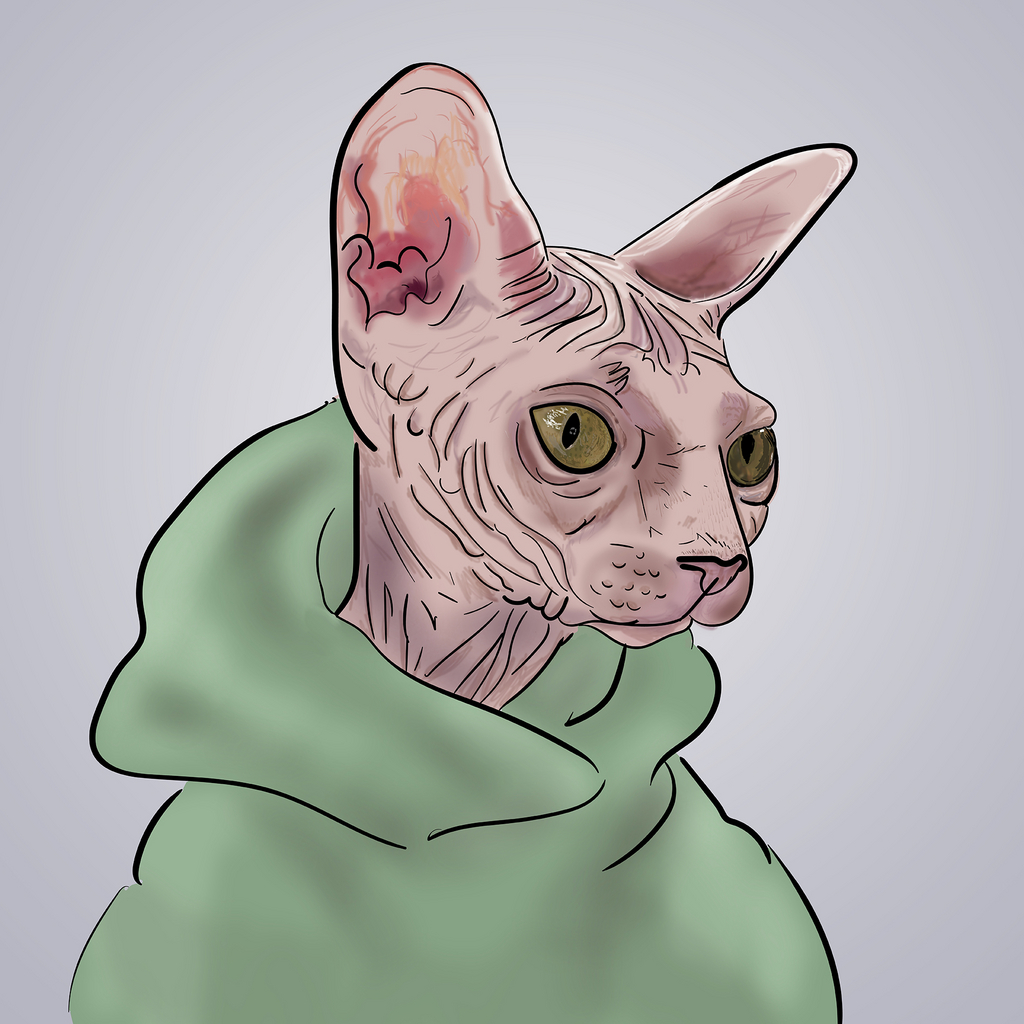 Cat Sphynx is a drawing of a picture of a cute Sphynx Cat from the interwebs. It's the first item of the first collection minted by artist GiantK for the SolMakers NFT brand. 33% of Royalties collected will be distributed monthly to holders of an Item of this collection. Holders must hold it unlisted for a month before starting to get royalties.